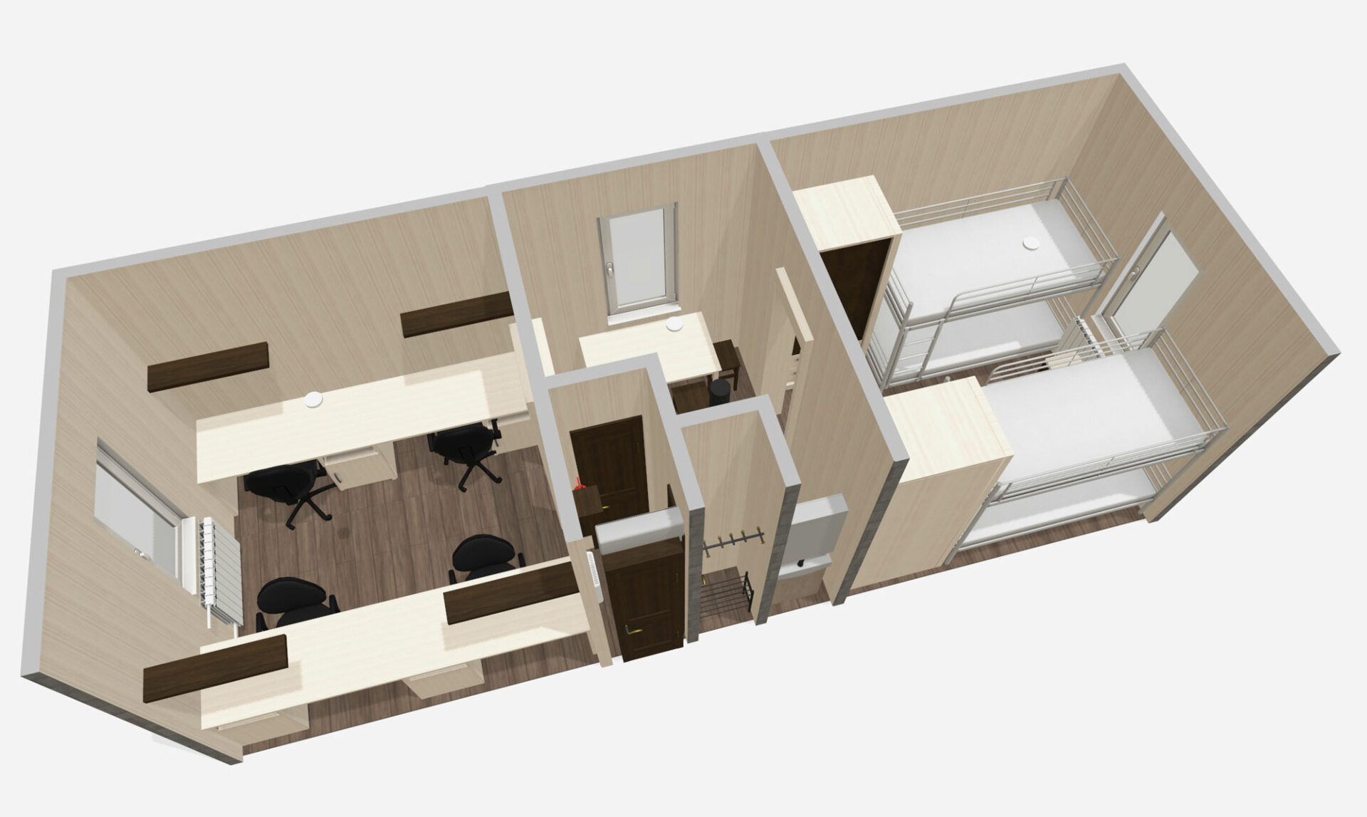 Бытовка жилая в одном модуле длиной 8 м2 на 4-х человек с 4-мя рабочими местами